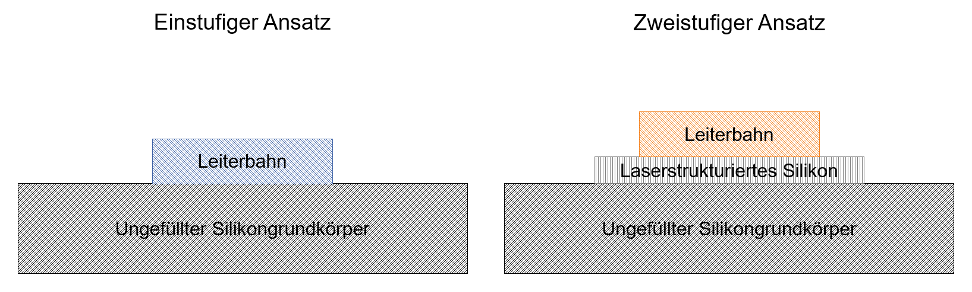 Innerhalb des Projekts werden zwei Ansätze zur Aufbringung der leitfähigen Strukturen verfolgt. Einerseits werden Silikonkautschuke direkt mit leitfähigen Füllstoffen versetzt, andererseits wird additiviertes Silikon laserstrukturiert und anschließend metallisiert.