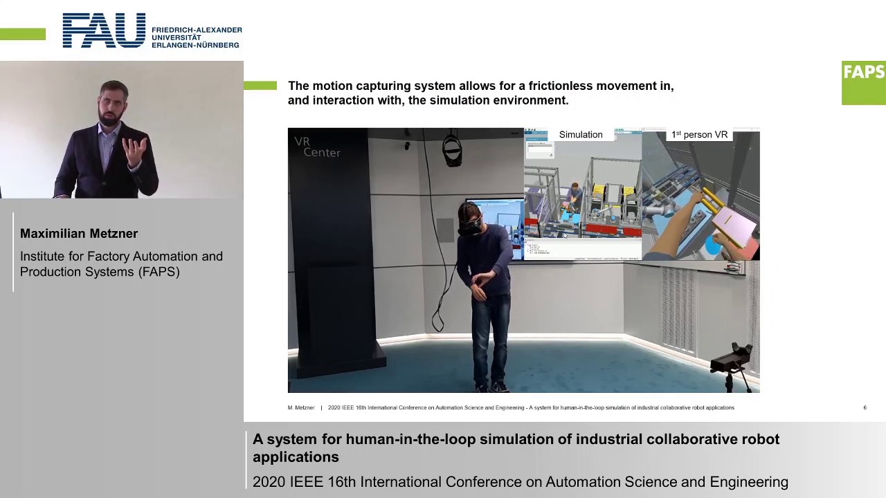 Die Veröffentlichung “A system for human-in-the-loop simulation of industrial collaborative robot applications” von Maximilian Metzner, Daniel Utsch, Matthias Walter, Christian Hofstetter, Dr.-Ing. Christina Ramer, Andreas Blank und Prof. Dr.-Ing. Jörg Franke wurde mit dem Best Application Paper Award der IEEE International Conference on Automation Science and Engineering (CASE) 2020 ausgezeichnet. Die IEEE CASE 2020 fand aufgrund der weltweiten Pandemiesituation nicht wie geplant in Hong Kong, sondern per Telekonferenz statt. Die IEEE CASE stellt als eine der drei Flagschiff-Konferenzen der IEEE Robot and Automation Science Society eine der wichtigsten und renommiertesten Konferenzen für Automatisierungstechnik dar.