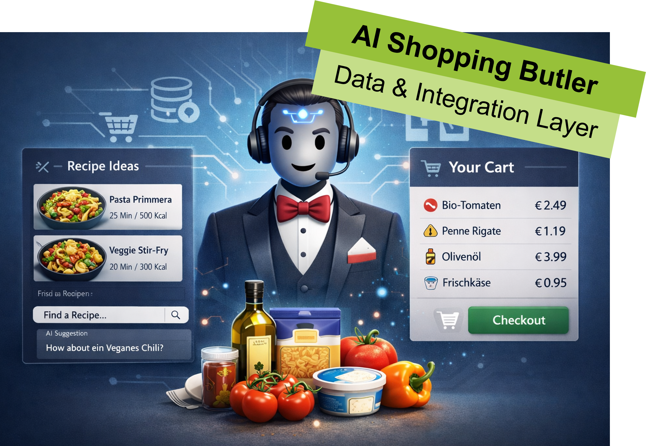 Wir entwickeln einen Shopping Butler für Supermärkte: einen agentischen AI-Assistenten, der Nutzer:innen direkt beim Online-Einkaufen unterstützt – von Gerichts- und Rezeptvorschlägen bis zur Auswahl konkreter Produkte und dem Befüllen des Warenkorbs. Der Butler soll nicht als externer Service, sondern embedded in die App/Website eines Supermarkts integrierbar sein (z. B. perspektivisch REWE Online, EDEKA, dm).